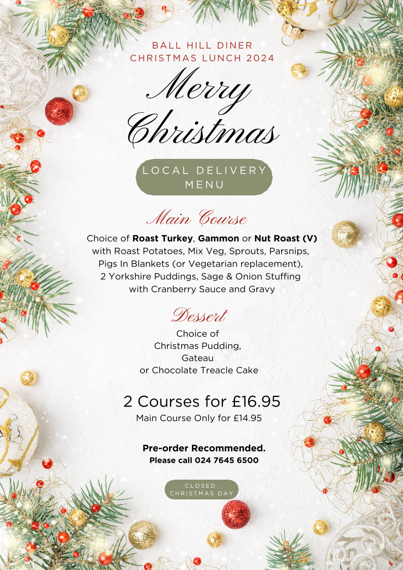with Roast Potatoes, Mix Veg, Sprouts, Parsnips, Pigs In Blankets (or Vegetarian replacement), 2 Yorkshire Puddings, Sage & Onion Stuffing with Cranberry Sauce and Gravy